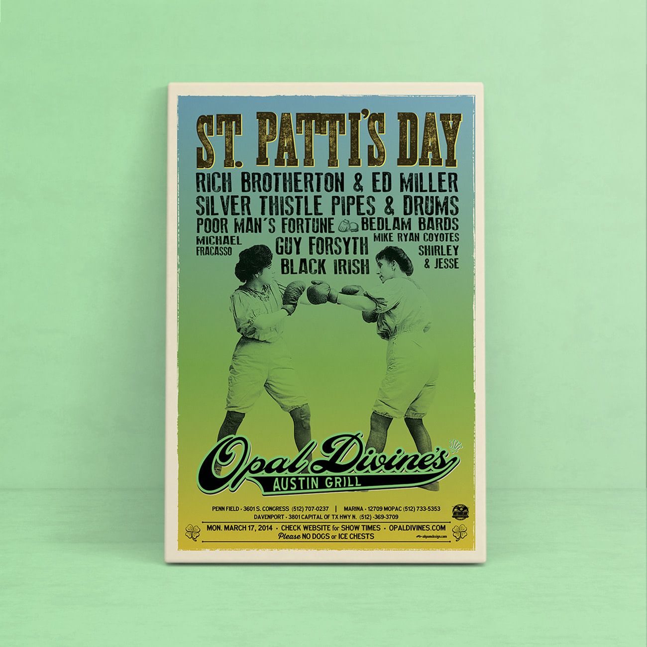 Poster and ad campaign for Opal Divine’s 2014 St. Patrick’s Day Festival. Project included digitally printed posters and coordinating advertising.