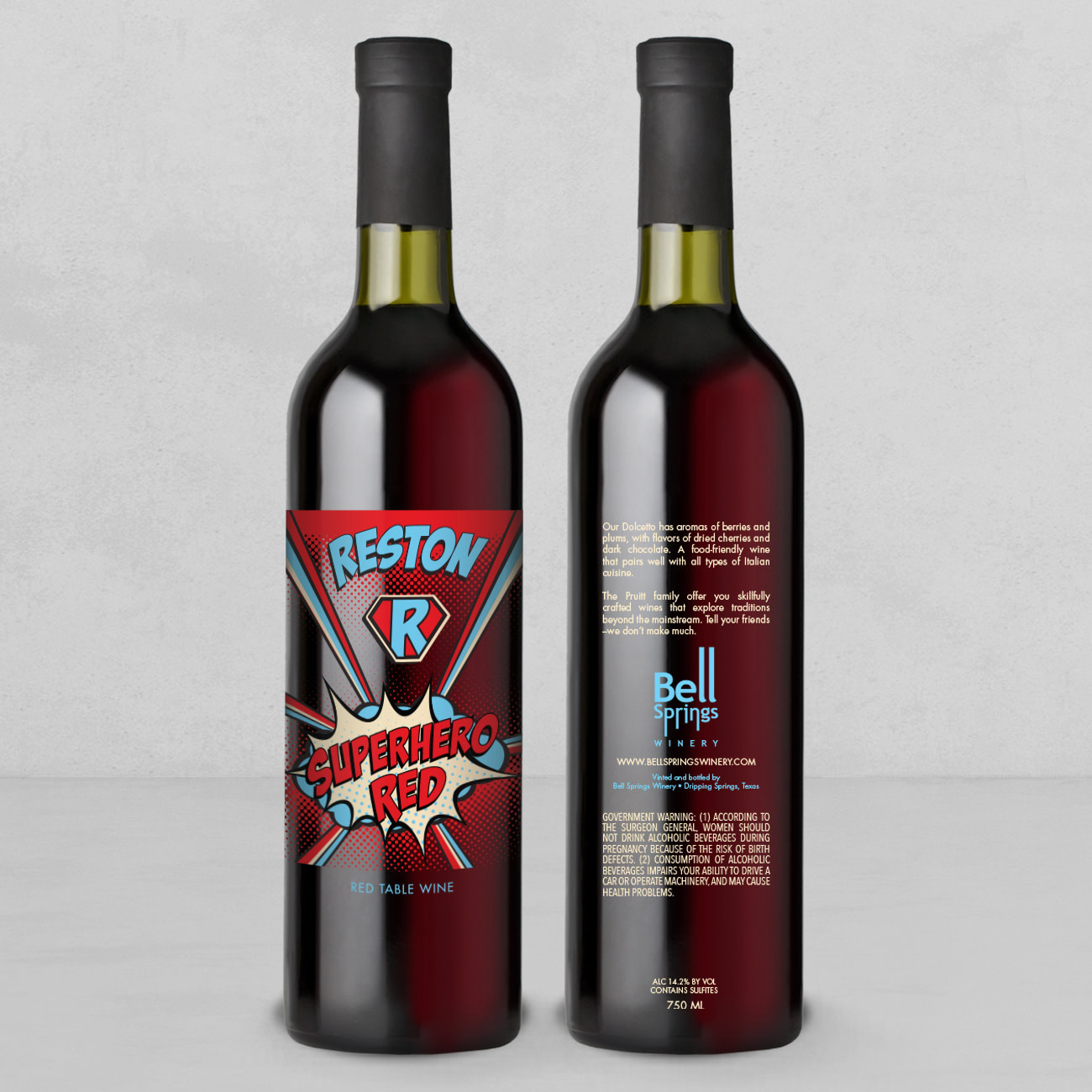 Reston Superhero Red is another playful wine bottle label design for Bell Springs Winery, located in the heart of historic Dripping Springs, Texas.
