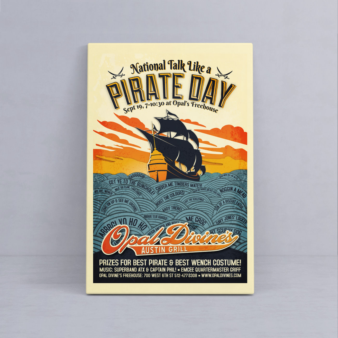 Darrrrrg! It’s our 2012 Talk Like a Pirate Day poster design including sunset colors and pirate words floating on the waves! Project included digitally printed posters and coordinating advertising.